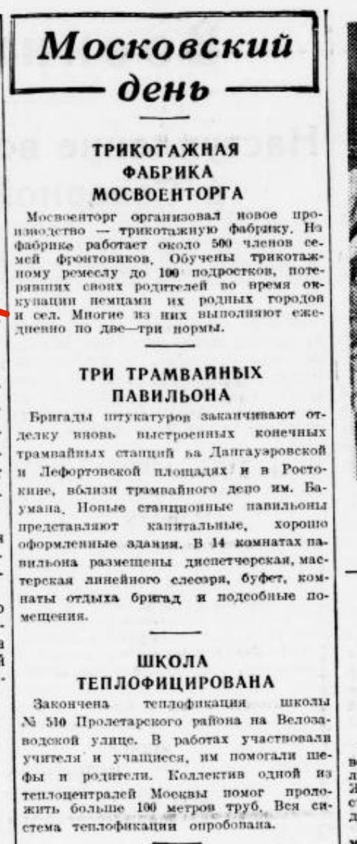 «…Закончена теплофикация школы №510 Пролетарского района на Велозаводской улице. В работах участвовали учителя и учащиеся, им помогали шефы и родители. Коллектив одной из теплоцентралей Москвы помог проложить больше 100 метров труб. Вся система теплофикации опробована».