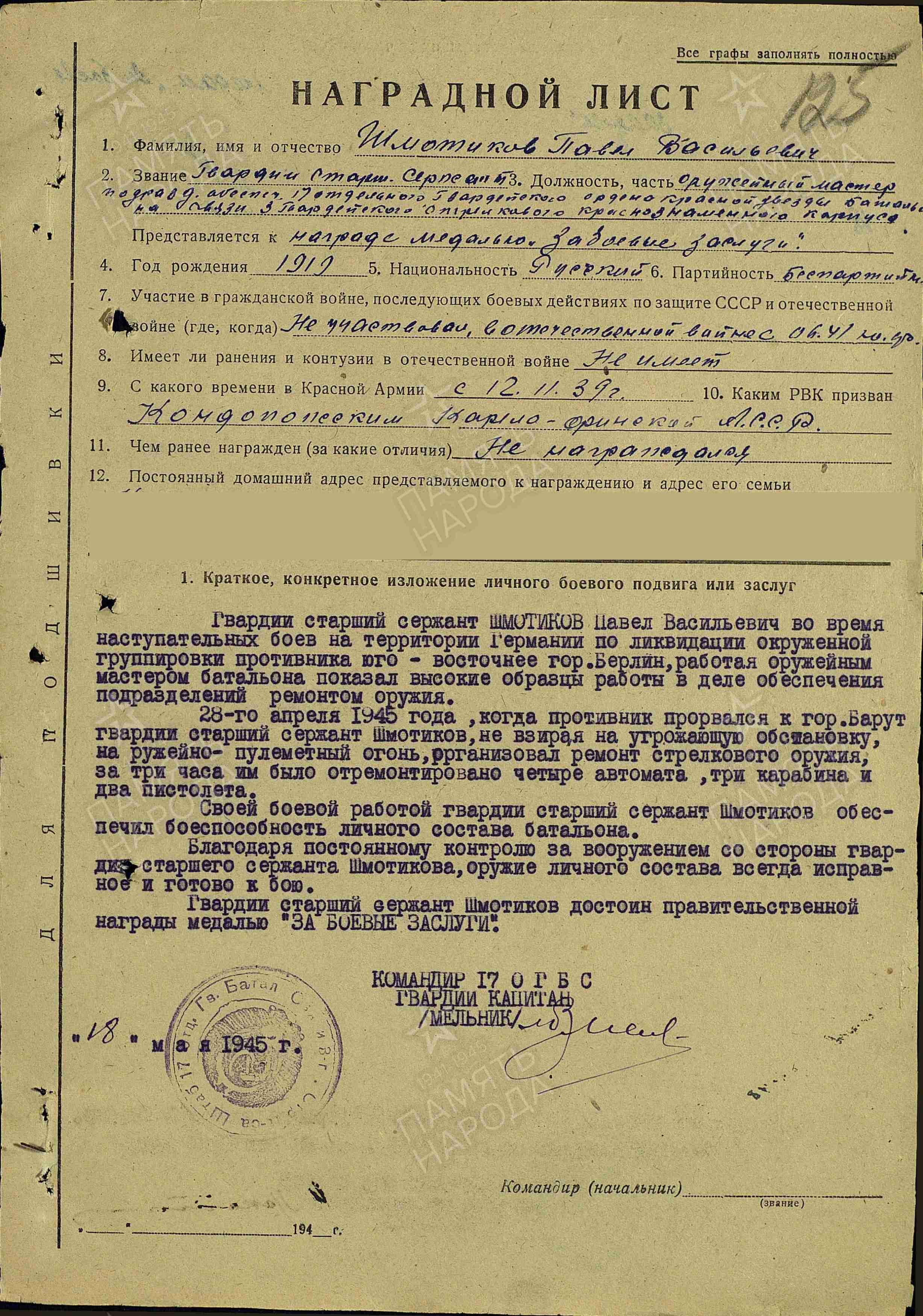 За свои подвиги во время Великой Отечественной войны удостоен множества наград. Так, 22 мая 1945 года он был награжден Медалью «За боевые заслуги». В наградном листе значится: «... Гвардии старший сержант ШМОТИКОВ Павел Васильевич во время наступательных боев на территории Германии по ликвидации окруженной группировки противника юго - восточнее гор Берлин, работая оружейным мастером батальона показал высокие образцы работы в деле обеспечения подразделений ремонтом оружия. 28-го апреля 1945 года , когда противник прорвался к гор Барут гвардии старший сержант Шмотиков, не взирая на угрожающую обстановку, на ружейно-пулеметный огонь, организовал ремонт стрелкового оружия, за три часа им было отремонтировано четыре автомата , три карабина и два пистолета. Своей боевой работой гвардии старший сержант Шмотиков обеспечил боеспособность личного состава батальона. Благодаря постоянному контролю за вооружением со стороны гвардии старшего сержанта Шмотикова, оружие личного состава всегда исправное и готово к бою. ...».