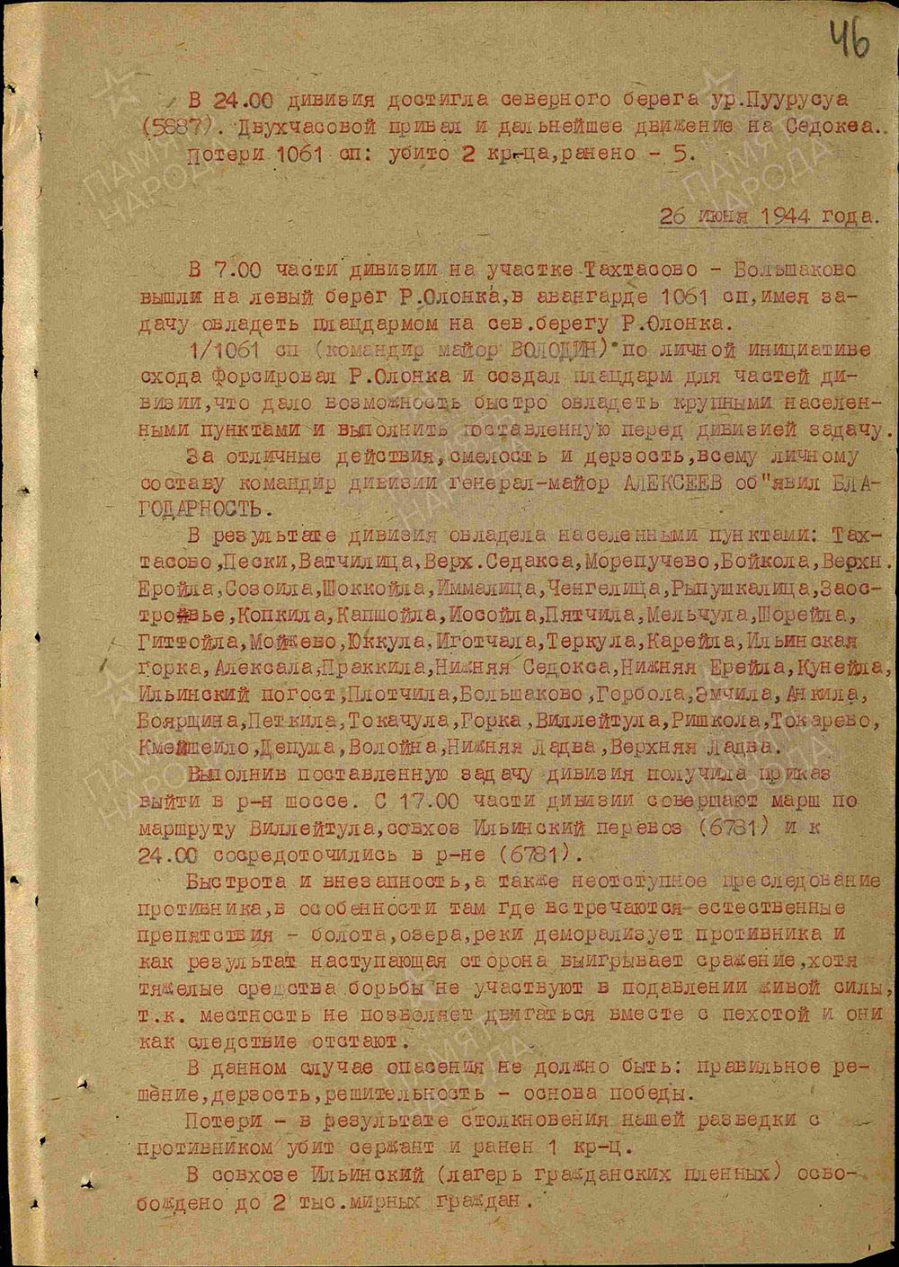 В ходе этой операции Алексей Малофеевич Абрамов погиб на поле боя 26 июня в районе деревни Сармяги. Был захоронен в братской могиле.