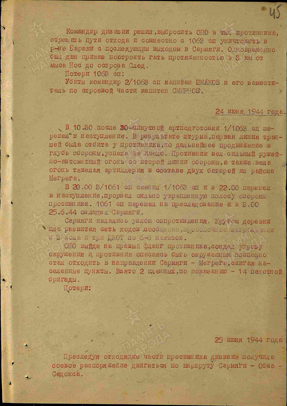 В рассекреченных документах воинской части есть описание боевых действий около деревни Сармяги.