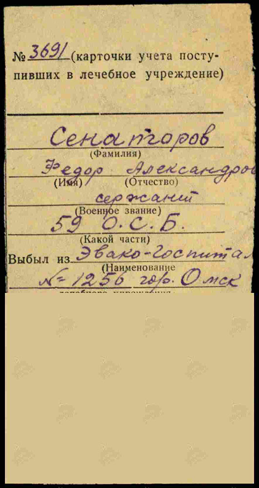 Федор Александрович пробыл на фронте чуть меньше двух лет. Был ранен на поле боя и отправлен в эвакуационный госпиталь 1256 в Омске. Спасти бойца врачам не удалось, он скончался 13 марта. Захоронен на Казачьем кладбище Омска.